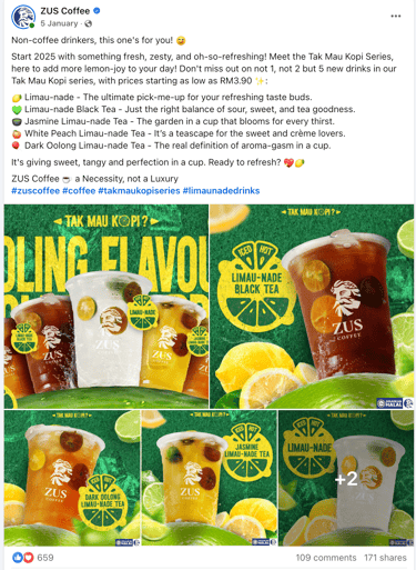 Ayat pembuka "Non-coffee drinkers, this one's for you! π" segera menarik perhatian golongan yang tidak minum kopi, menjadikan mereka rasa lebih dihargai oleh jenama kopi ini.