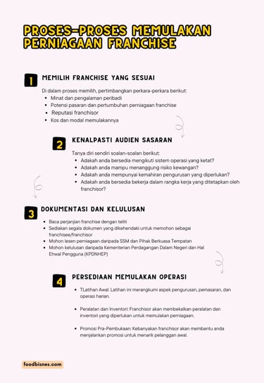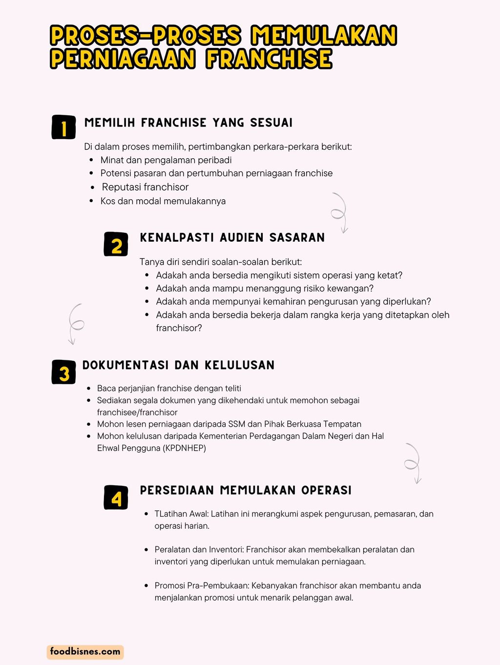 Artikel ini memberikan panduan lengkap kepada sesiapa sahaja yang berhasrat untuk menceburi perniagaan franchise makanan di Malaysia. Pelbagai maklumat dikongsikan; meliputi proses-proses yang terlibat dan peraturan-peraturan yang mesti dipatuhi oleh franchisor dan franchaisee.