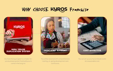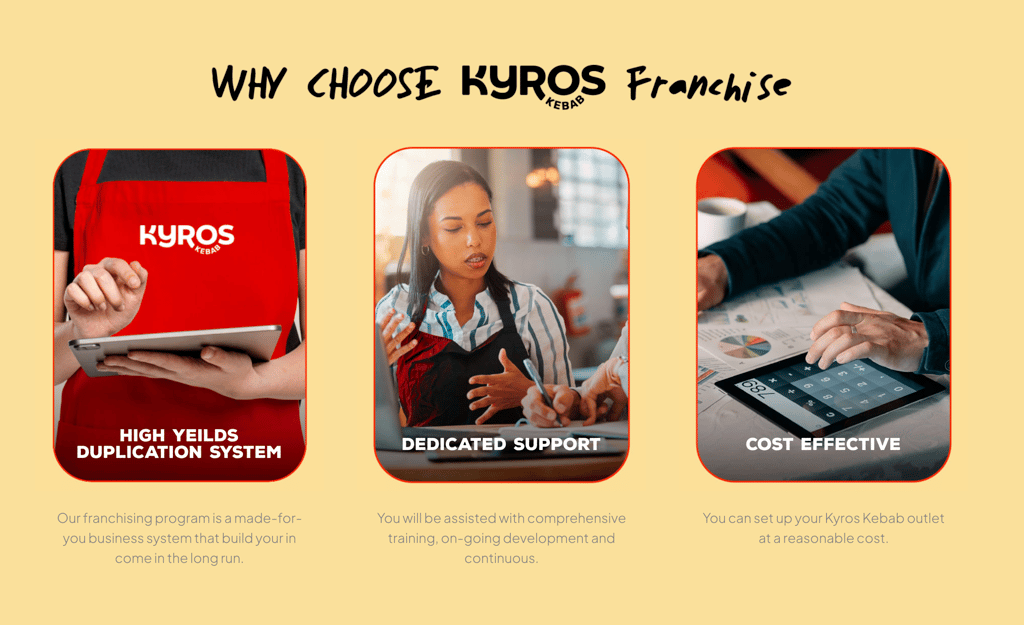 Kyros Kebab - antara jenama tempatan yang ditubuhkan pada 1996 telah berkembang di seluruh Malaysia melalui sistem franchise. Permohonan untuk menjadi franchisee mereka boleh dibuat melalui laman web mereka di SINI.